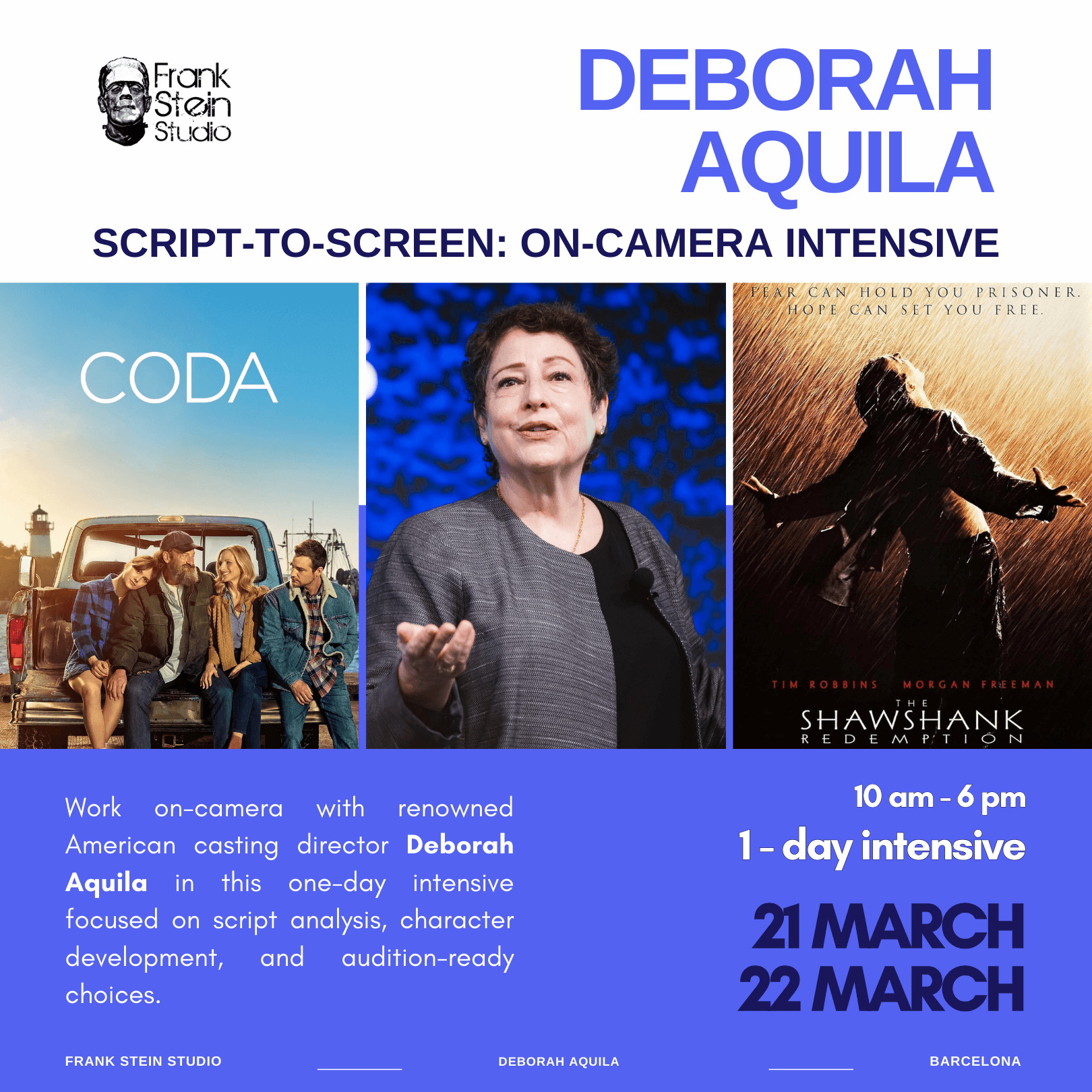 Step into the room with one of the most respected American casting directors. In this focused, one-day on-camera intensive, Deborah Aquila—whose career spans films such as Sex, Lies and VideotapePrimal FearLa La Land, and CODA, along with senior casting leadership at Paramount and CBS Studios—offers actors a technique-driven look at what truly makes a performance land.